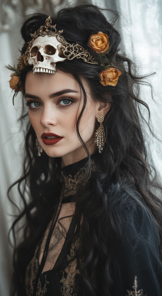 This hairstyle is half bone-chilling, half breathtaking, and it is fit to the queens of the underworld. This crown, which is made of gilded florals and an actual skull of a bone-white colour, makes it seem like a fantasy or Renaissance dark fairytale. It is spooky, majestic and throne-worthy.