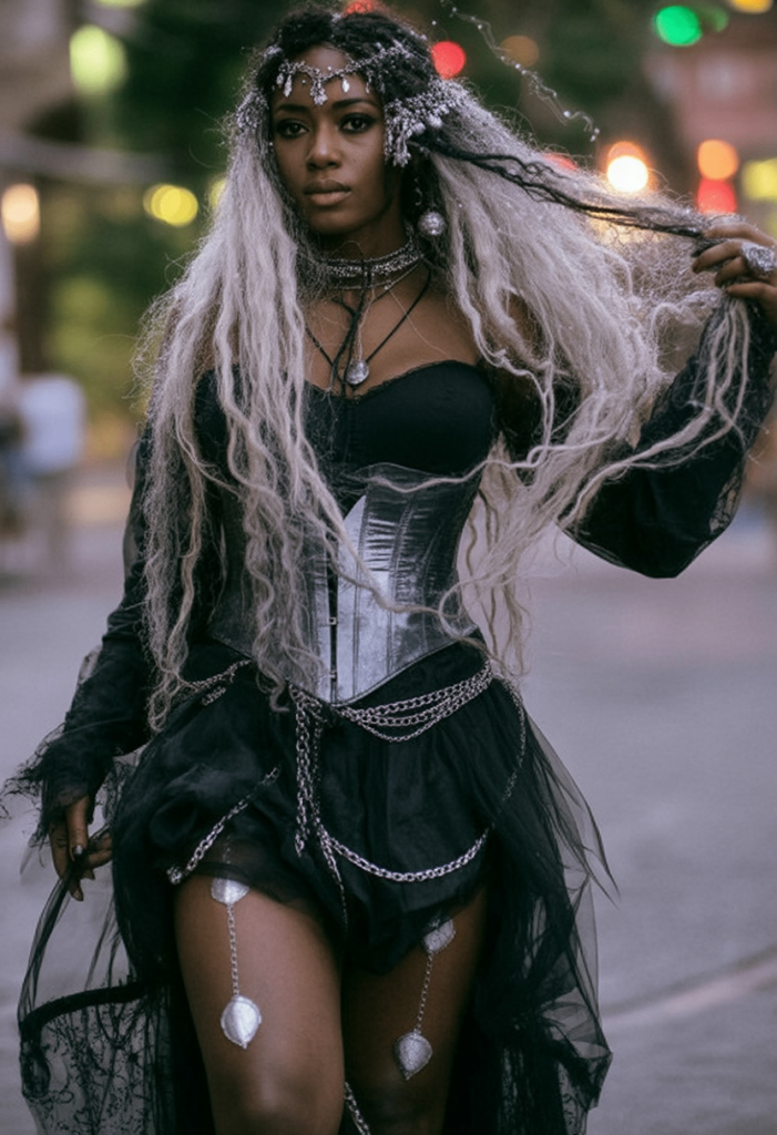 It is a mystical style, which makes you feel like you had entered the dream of your ancestors. The lengthy and curvy locs punctuated with white are exuding that other worldly power of the moon-blessed force, think Halloween and high fashion. It is witchcraft with a touch of sophistication and presence and is designed to fit the person who commands the room wherever she goes.