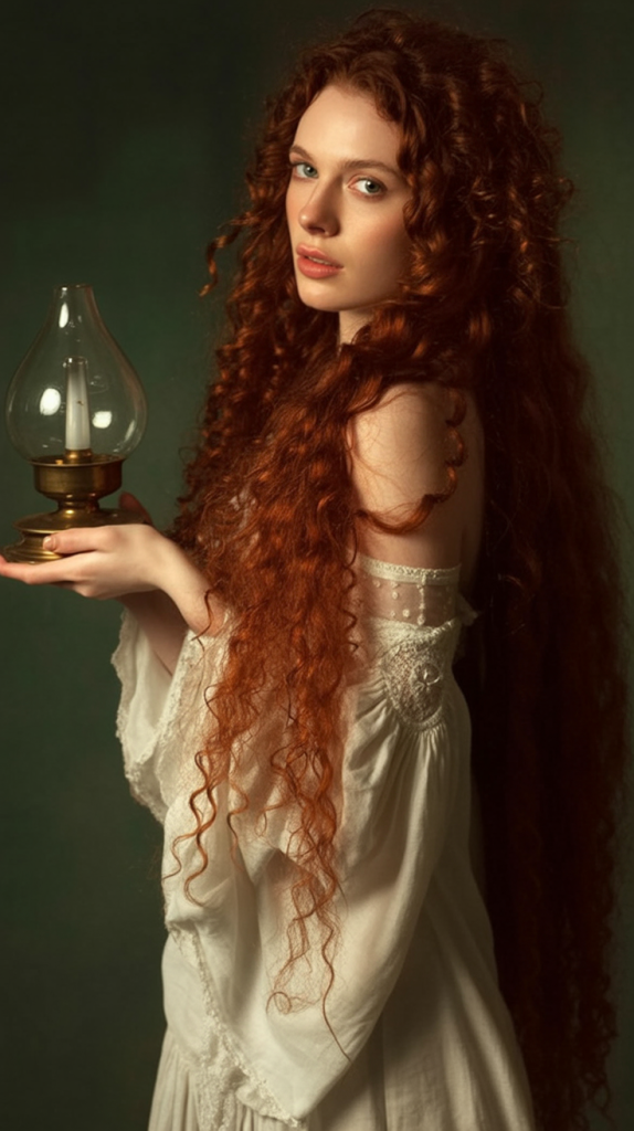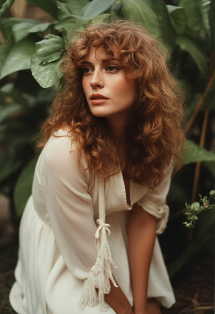 It seems this cascade of auburn curls has millennia of secrets. It is romantic, wild and carries with it that raw forest energy, the stuff of hair in candlelight and ancient libraries. There’s a soft intensity here that’s equal parts beauty and power.
