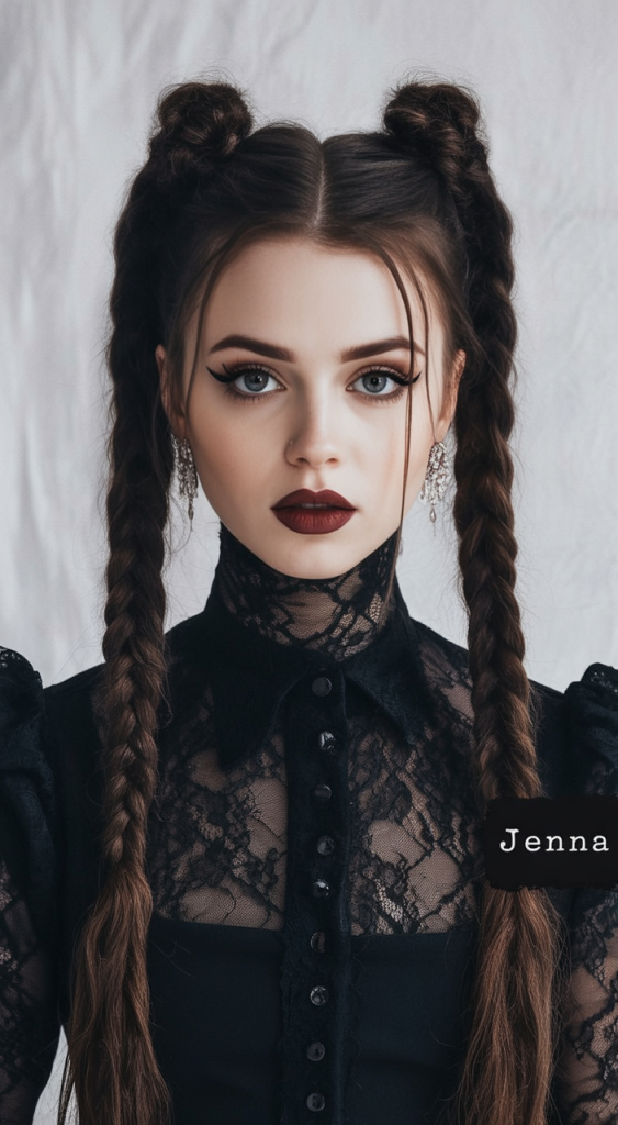 This appearance is the charm created in the times of a lunar eclipse. The two buns combined with the long braids and crisp parting are potent, emphatic and not the least shy. It is such a style that appeals to both dark and playful magic, the gothic style gets a heavy tip of the hat to and there is an innocence yet enough of it to make up the difference.