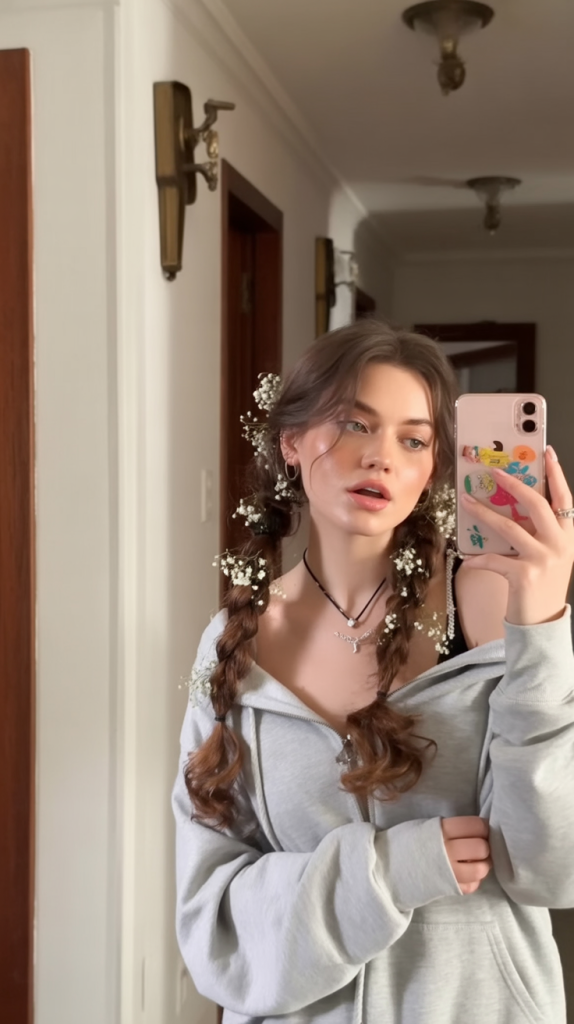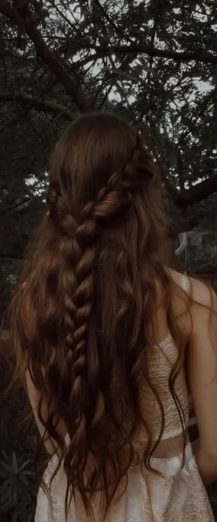 This braided half-up hairstyle is as though it is imagined during a moonlit canopy in the depths of the forest. It’s romantic, ethereal, and grounded — like the kind of hair you’d wear while gathering herbs and whispering intentions to the wind. There’s something grounding about it, something timeless.