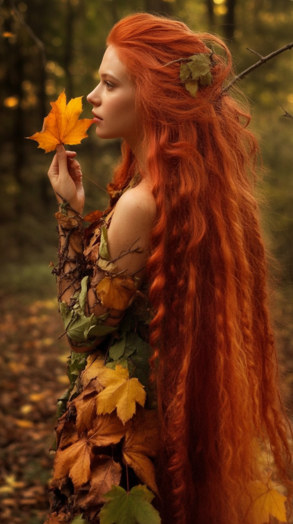 The woman is pure nature she is wild, she is hot, she is breathtaking. This fiery copper hair with its silky locks and foliated top reminds that the soul of fall became a person. It is something primitive, as an echo of archaic power blowing between the leaves.
