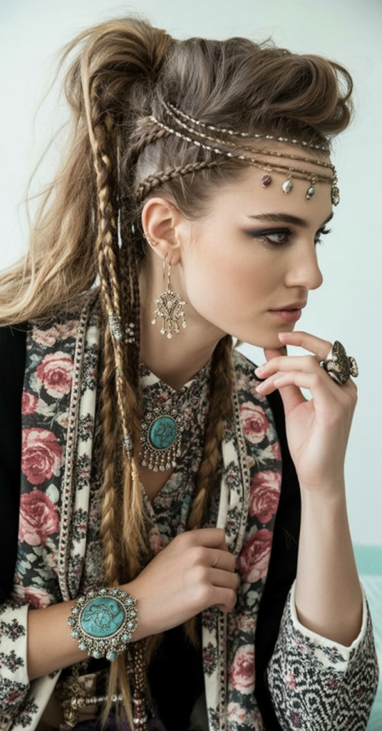 This is art as hairdo: a bit of Renaissance, a bit of bohemian priestess, and all powerful. The complicated plaits and fine strings tell you that you are a woman who creates her own reality and is strong on wearing ancestors as a crown. It’s a celebration of heritage, beauty, and ritual.