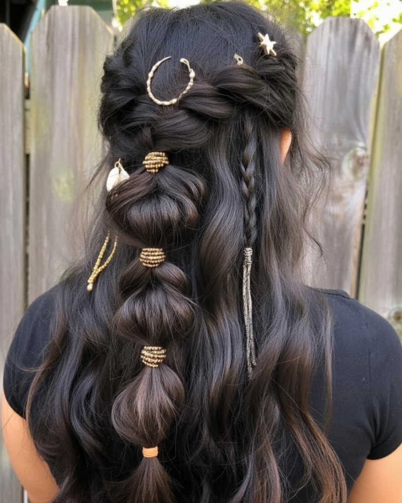 This style is pure stardust. The combination of bubble ties, twisted strands and space-adjacent decor reminds very much of the moon-priestess-makes-Halloween kids I got. It is innovative and free-spirited with the right amount of mess hidden in each loop and pin.