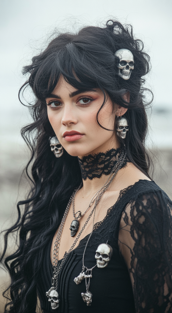 This is full of the drama of a Wicked musical finale. Thick, curly hair with windswept bangs and properly selected skull decorations make this look theatrical, trendy and highly feminine. It’s the kind of hair that practically commands respect.