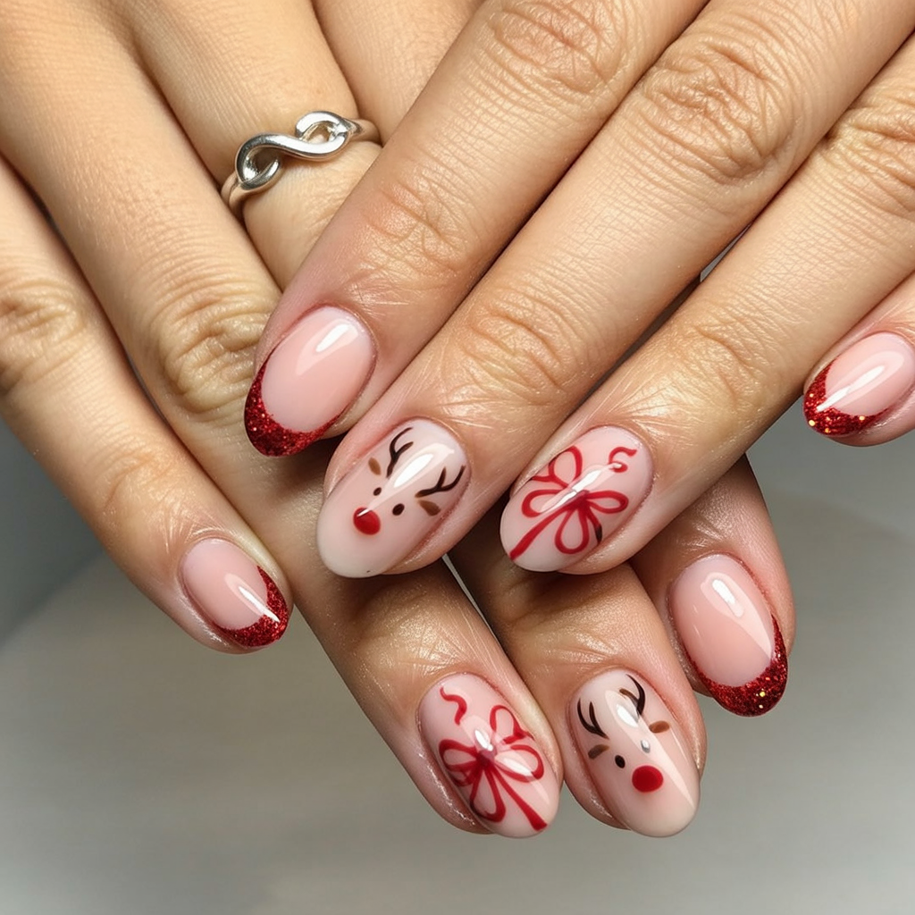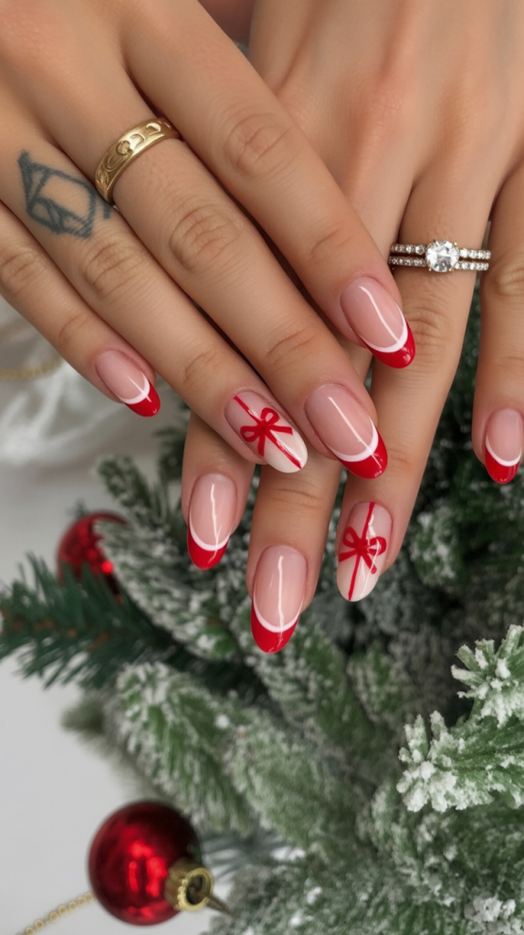 A fresh take on the classic French tip, this design pairs bright red tips with dainty red bows for a look that’s both elegant and cute. It’s like unwrapping a beautifully tied gift—subtle from afar, but detailed and festive up close. It’s the kind of manicure that instantly lifts your holiday mood.