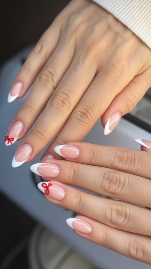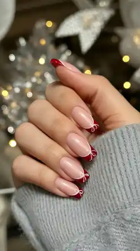 This elegant French tip design gets a festive upgrade with tiny red bows delicately painted at the base of the nails. The crisp white tips keep the look clean and timeless, while the bows add just the right amount of holiday charm—like the finishing touch on a beautifully wrapped present.
