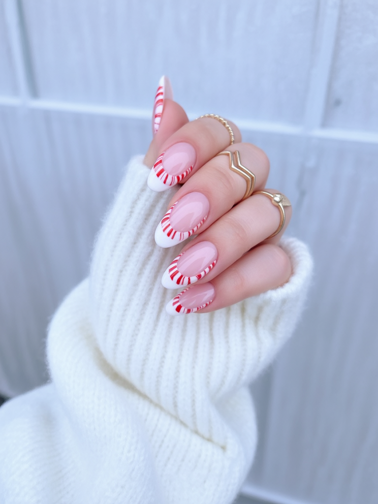 This peppermint-inspired French tip design is a festive twist on a classic. The crisp white base combined with red candy cane stripes around the edges instantly brings cozy winter vibes. It’s playful yet elegant—perfect for anyone who loves holiday nails that make a subtle statement while still feeling fun and seasonal.