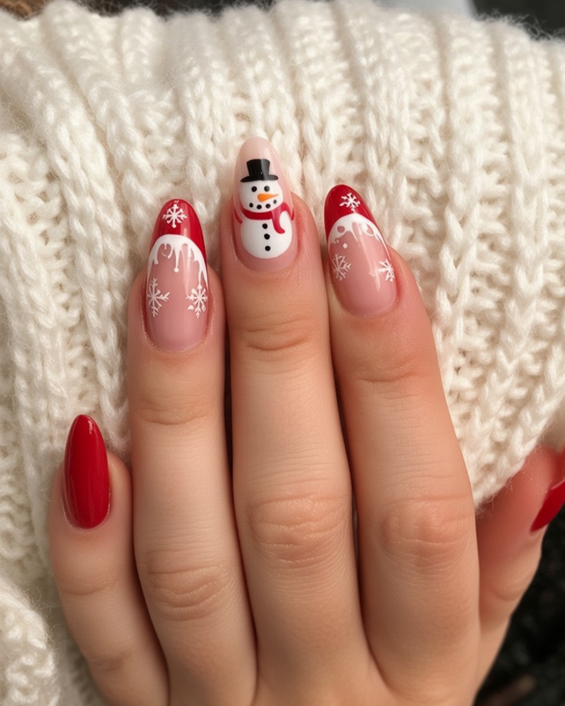 This look works beautifully on almond nails, giving space for the detailed snowman art. The red base makes it pop, and the design is versatile—it pairs easily with casual winter sweaters or a festive party outfit, making it a standout for the holiday season.