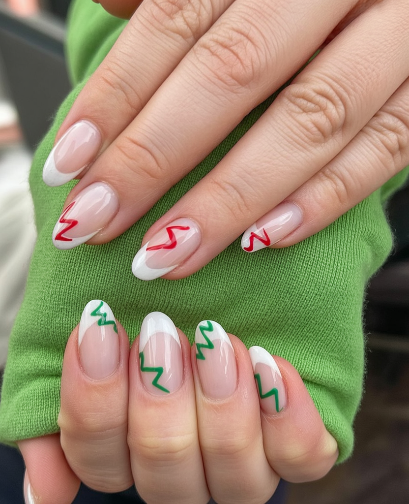 This playful twist on French tips swaps straight lines for red and green zigzags, creating a look that’s modern, fun, and unmistakably festive. It’s simple enough for everyday wear but has that extra spark to stand out during the holidays. The crisp white tips keep it balanced and fresh.
