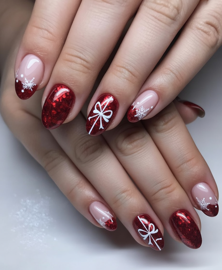 For those who love a little extra sparkle, these red glitter French tips are pure holiday magic. The rich, shimmery red paired with delicate white bows and snowflakes creates a look that’s both elegant and festive. It’s like wearing your favorite holiday decorations right at your fingertips.