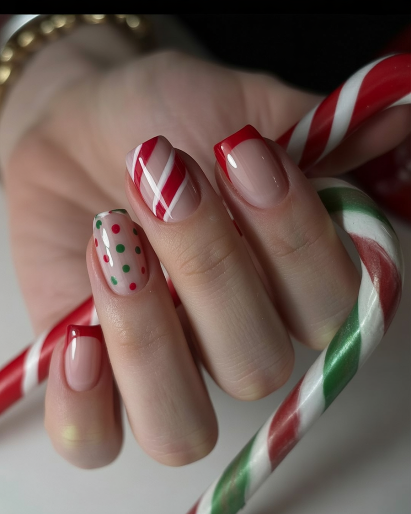 This mani brings together all the classic holiday colors in one super fun way—red French tips, candy cane stripes, and green-and-red polka dots. It’s like being at a festive party where every detail is cheerful and bright. A nude soft base balances the mix of patterns keeping it interesting at the same time.