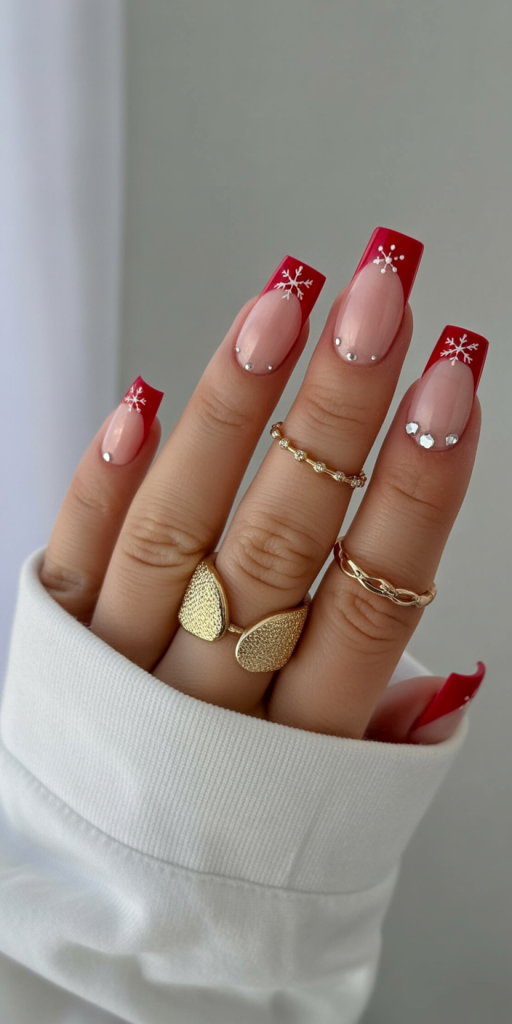 This bold red square French manicure is elevated with delicate white snowflakes and sparkling rhinestones, giving it a glamorous holiday finish. It’s festive without being over the top, perfect for winter celebrations or elegant Christmas parties.
