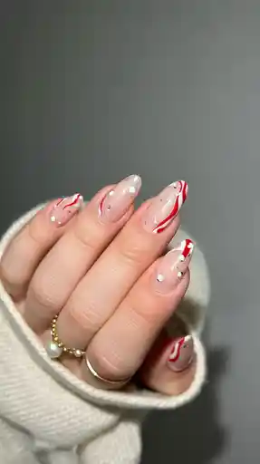 Red and white swirls dance across these almond nails, giving off strong candy cane vibes in a modern way. The translucent base keeps the design airy and soft, while subtle rhinestone accents add a touch of sparkle that catches the light beautifully.