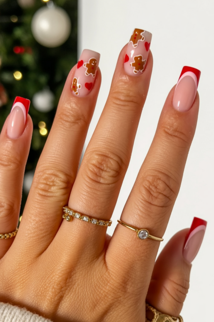 Nothing says holiday cozy like gingerbread cookies and candy-red hearts. This design mixes cute gingerbread figures with classic red French tips, creating a playful and nostalgic look that feels straight out of a festive kitchen.