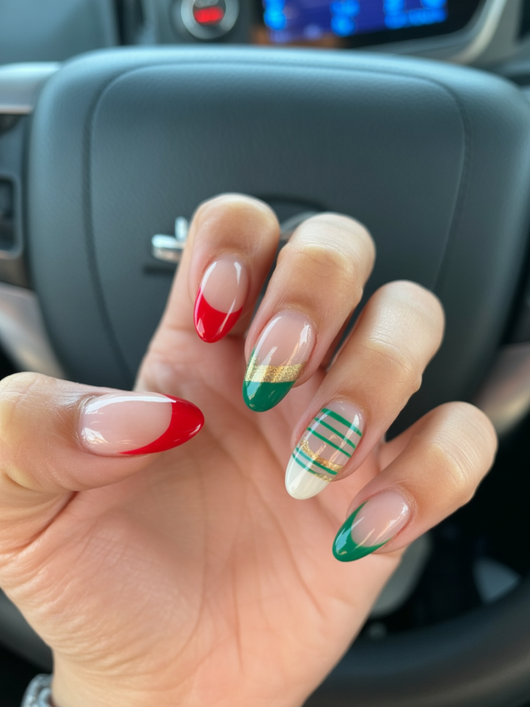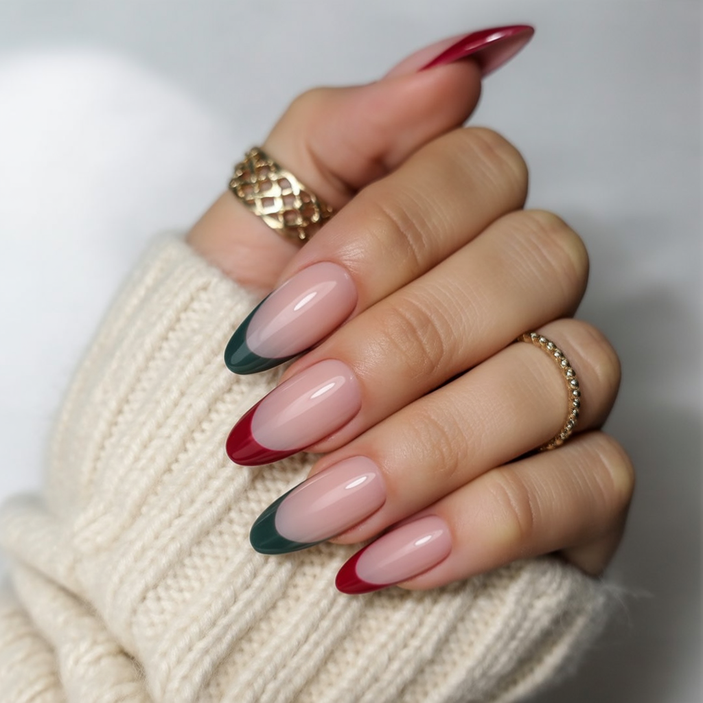 A modern twist on classic holiday nails, this look pairs deep green and festive red French tips on a glossy nude base. The alternating colors keep things playful while still looking clean and intentional. The almond shape adds elegance, balancing out the boldness of the tips.