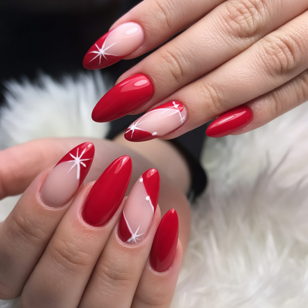 This almond manicure dazzles with its vibrant red tips and delicate white starburst accents. The stars bring a magical, festive glow—like twinkling holiday lights—while the red polish keeps the design classic and striking. It’s bold without being overwhelming, making it perfect for parties and festive gatherings.