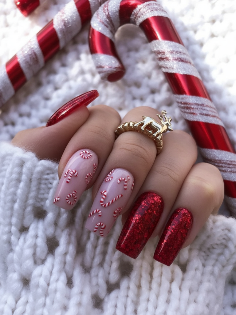 Nothing says Christmas quite like candy canes and sparkles. This long square manicure features tiny candy cane patterns on a soft pink base, paired with high-impact red glitter nails for a festive contrast. It’s a fun and whimsical design that still feels polished thanks to the structured shape.