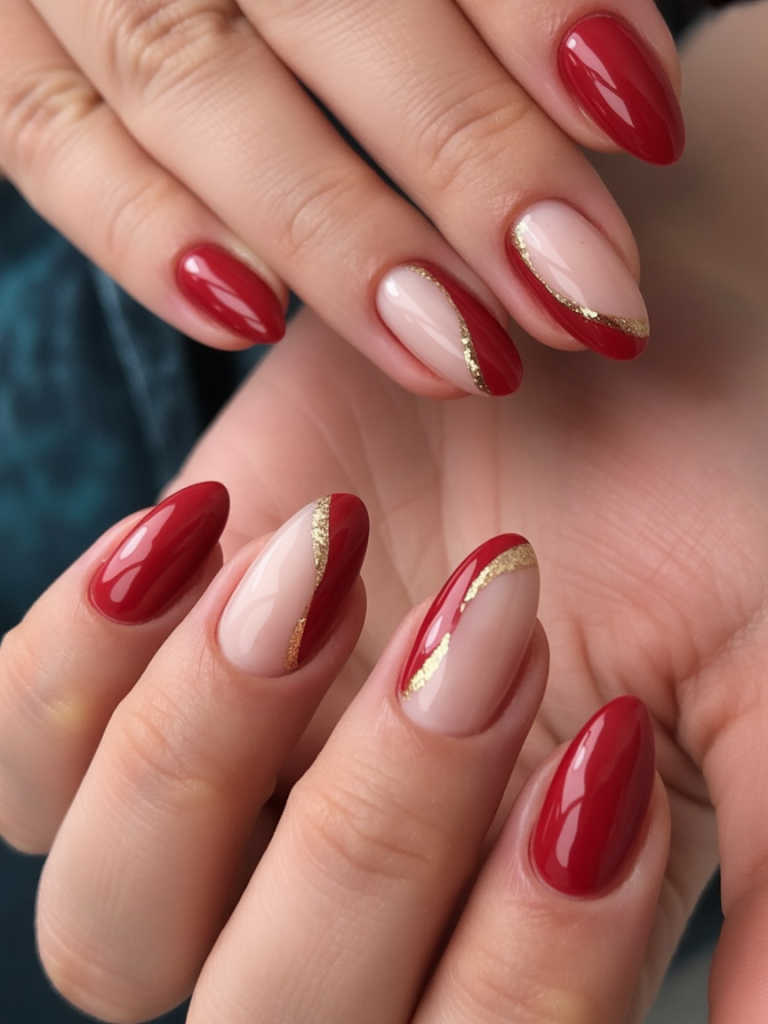 This elegant red almond manicure is elevated with shimmering gold accents that trace the edge of each French tip. The combination of glossy red and gold detailing gives it a luxurious, festive look reminiscent of holiday ornaments and gift wrap.