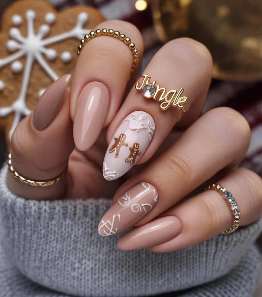 This cozy almond manicure blends warm nude tones with cute gingerbread and icing-inspired designs. The accent nails showcase tiny gingerbread figures outlined in white frosting-like details, bringing a sweet, nostalgic touch to the overall look. It’s chic, playful, and perfect for anyone who loves holiday baking or a soft neutral palette.