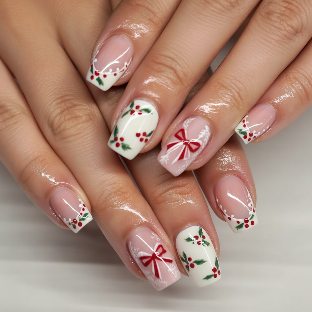 The square shape gives this design a timeless feel, and it works particularly well on short to medium lengths. This look is great for anyone who wants something holiday simple but full of charm. A glossy topcoat ensures the holly and ribbon motifs stay crisp, making it a perfect choice for both holiday dinners and everyday wear.