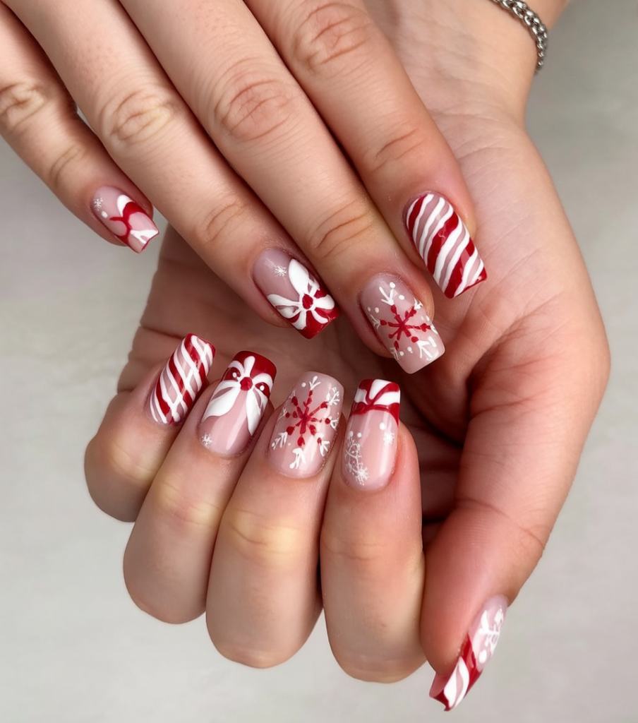 Nothing says Christmas quite like candy cane stripes paired with bold red and white snowflakes. This design blends fun and festive energy with a touch of sophistication, making it feel instantly cheerful. Each nail has a slightly different pattern—bows, stripes, snowflakes—which keeps the overall look dynamic and interesting without feeling overwhelming.