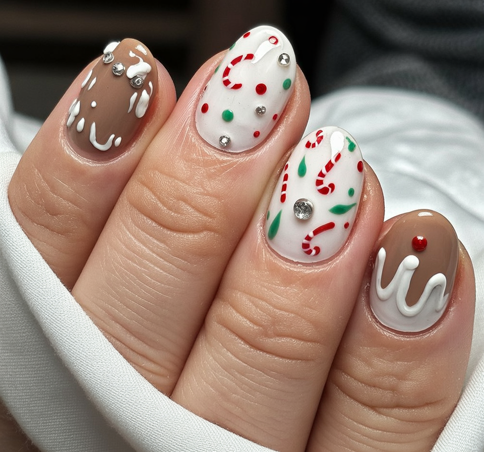 This playful holiday nail design looks good enough to eat. Warm brown tones mimic the look of gingerbread cookies, while the white icing drips and sparkling rhinestones add a fun, festive touch. The candy cane patterns on the white base give it that classic holiday sweetness—like decorating cookies on a cozy winter afternoon with friends.