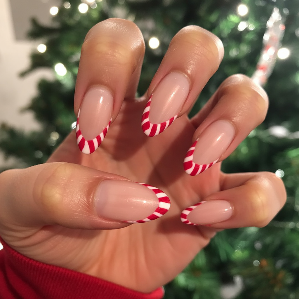 Classic French tips get a festive twist with candy cane stripes wrapping around the almond shape. The clean nude base keeps the look sophisticated, while the red and white pattern brings all the holiday cheer you need. It’s simple, striking, and perfect for those who love a playful nod to the season without full nail art.