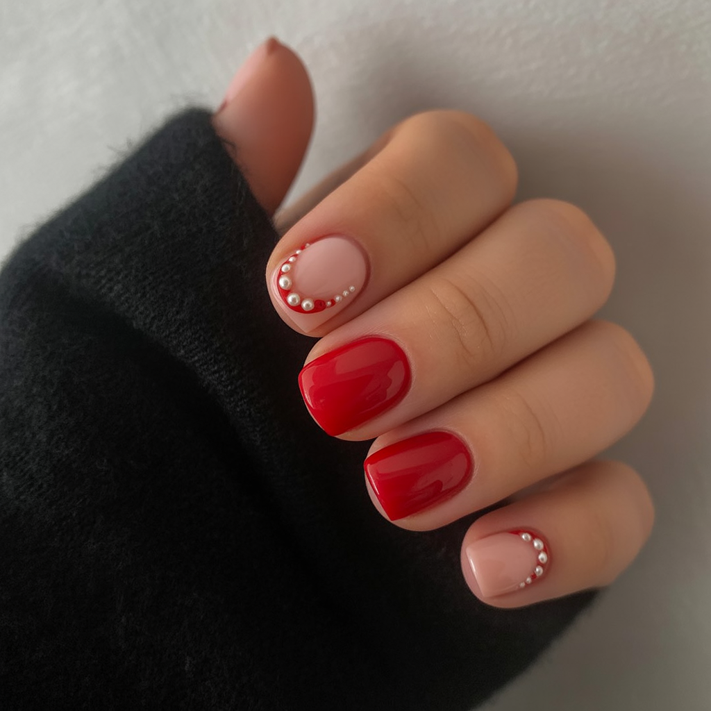 This design is especially flattering on short square nails and is easy to maintain throughout the holiday season. The combination of bold red and delicate pearl curves gives it a classy, modern finish that works for both casual gatherings and dressier events.