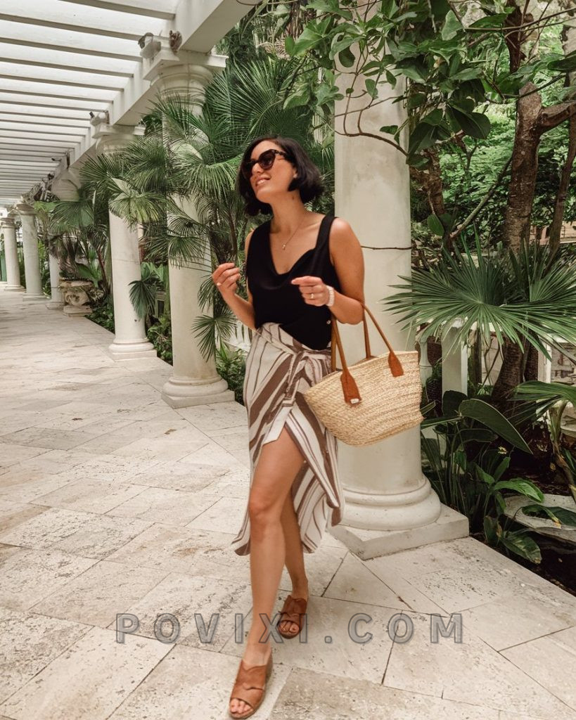 A perfect blend of aesthetic and comfort, this look embraces the summer spirit. A black cowl-neck tank top is effortlessly paired with a beach-ready striped wrap skirt, allowing for an elegant yet relaxed vibe. Accessories like a woven tote bag and brown slip-on sandals complete the look. The mix of neutral tones ensures a versatile outfit that transitions from beach lounging to a sunset dinner seamlessly. This outfit is ideal for those who love breathable fabrics and a lightweight feel without sacrificing style. It can be dressed up with gold jewelry or kept casual with a straw hat and oversized sunglasses.