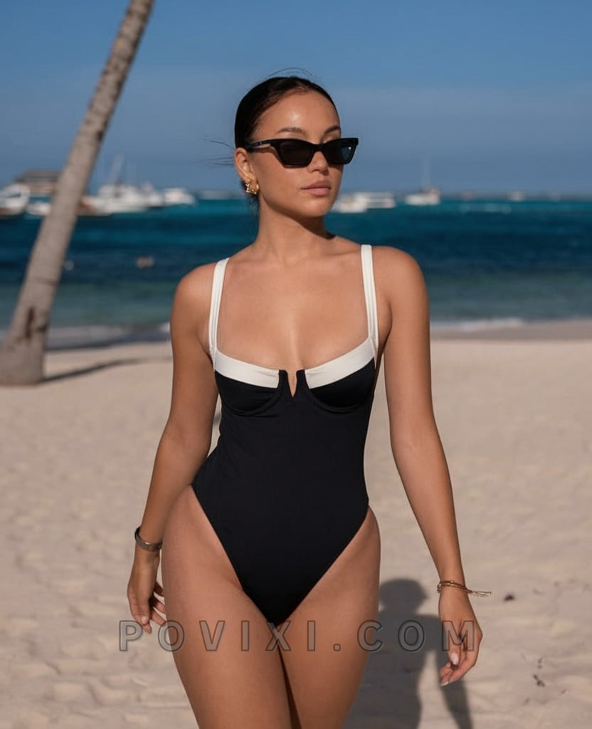 This black one-piece swimsuit redefines minimalism with its sleek design and contrasting white straps. The subtle cutout at the bust adds a sultry edge, making it a perfect choice for those who love an effortlessly elegant aesthetic. Pair it with oversized sunglasses and gold accessories for a baddie look. Complete the ensemble with a sheer, lightweight sarong for a more refined touch when stepping away from the water.