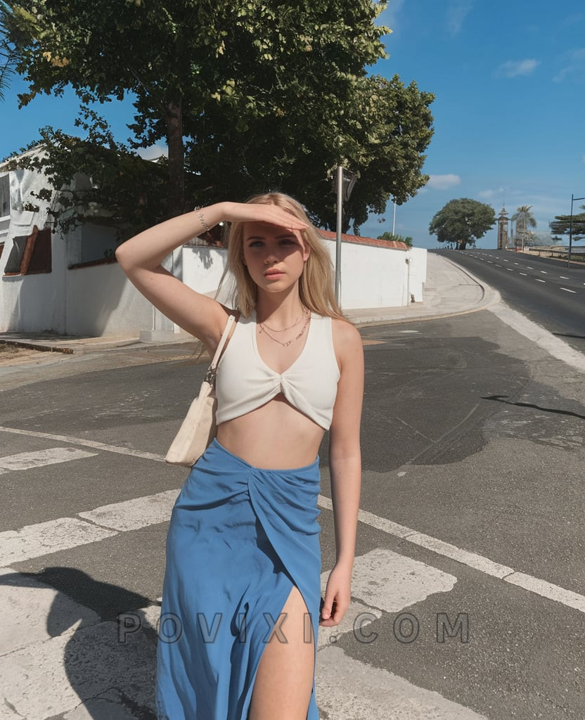 For a beachside brunch or an evening stroll, this outfit pairs a knotted white crop top with a sky-blue slit skirt for an effortless yet fashionable statement. The monochrome pairing exudes coastal charm, making it a standout aesthetic choice. A pair of strappy sandals and delicate layered necklaces add an elevated yet understated elegance to the look.