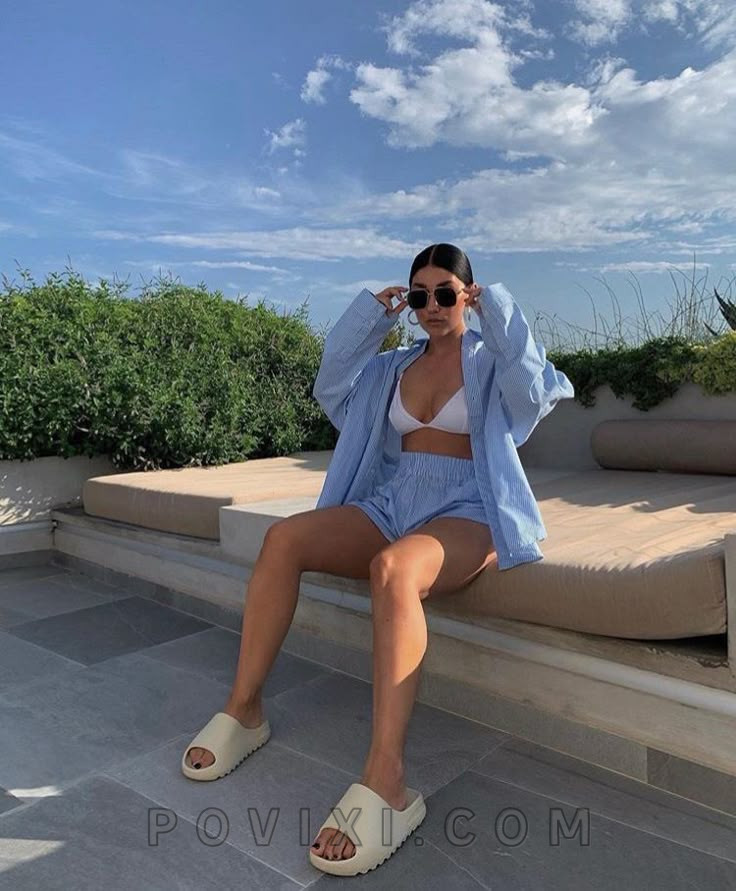 A striped lounge set, consisting of matching shorts and an oversized button-down shirt, is perfect for transitioning from beachwear to casual street style. Worn over a white bikini, this set exudes effortless coolness. Pair it with slides and round sunglasses for a perfect baddie aesthetic. This look is also ideal for poolside parties where style and comfort go hand in hand.