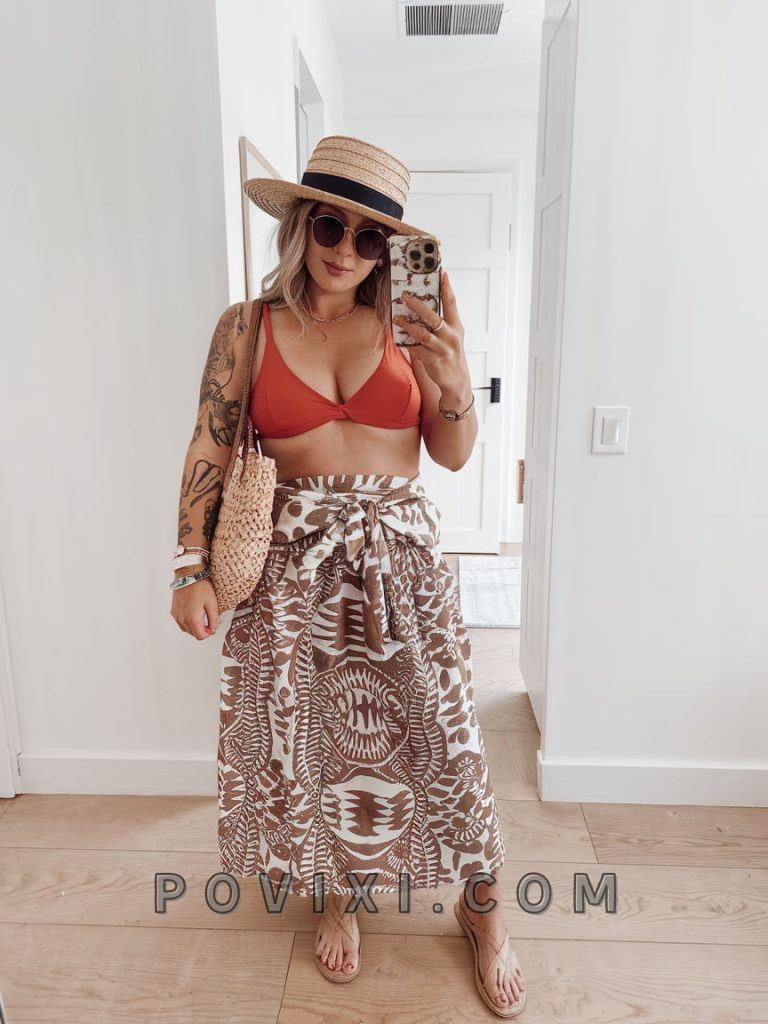 For a relaxed but stylish beach vibe, a burnt orange bikini with a flowy, printed sarong wrap is a must-have. The earthy brown and beige color palette keeps the outfit grounded while still feeling effortlessly chic. Accessories play a crucial role in this look—a wide-brim straw hat, round sunglasses, and woven bags complete the bohemian summer aesthetic. If you love ideas for black women, consider swapping the color scheme for a deep burnt yellow or rich blue to complement deeper skin tones. Size-inclusive styling is key here, as the sarong can be tied in multiple ways to flatter different body shapes.