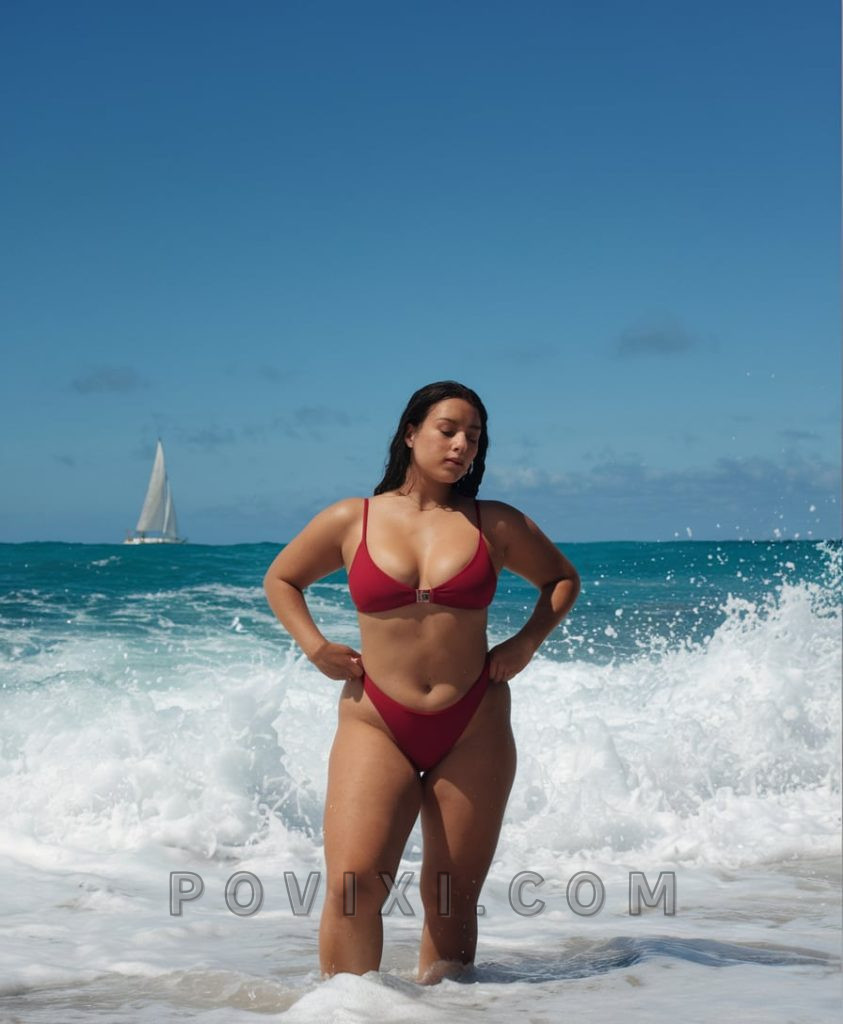 Nothing makes a statement quite like a red bikini against the backdrop of crashing ocean waves. This simple yet striking two-piece is size-inclusive and flattering, with a high-cut bottom that elongates the legs and a structured top for support. Minimal accessories keep the focus on the bold color choice, but adding a thin gold chain or a sheer cover-up can add an extra layer of sophistication. If you’re looking for ideas for black women, a deep wine-red or cherry tone can enhance rich skin tones beautifully.