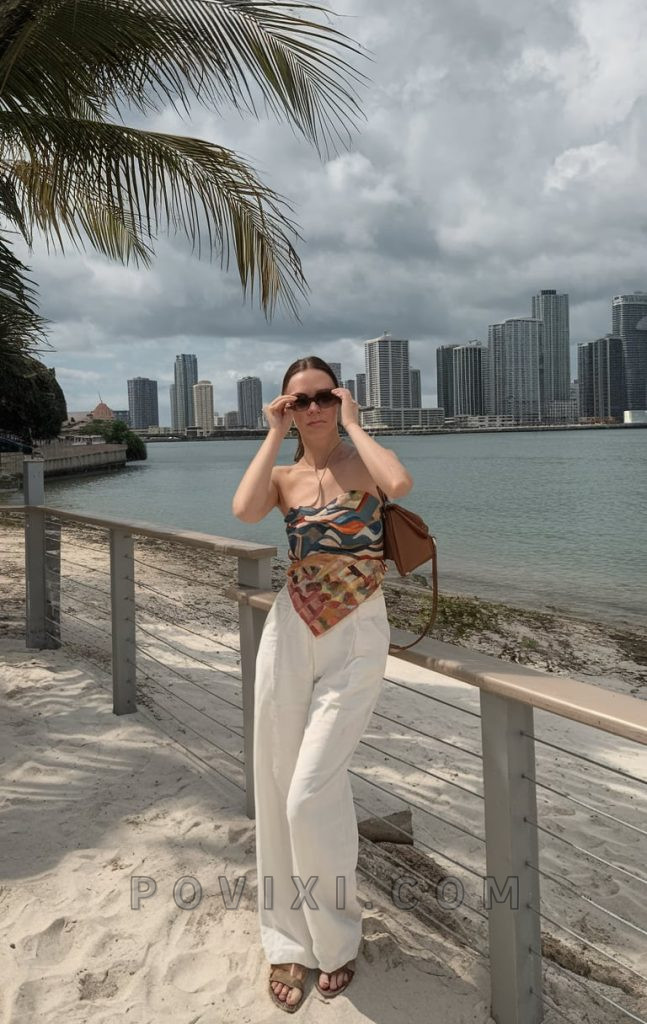 For those who love ideas cover up, this combination of a light blue oversized button-down shirt with white wide-leg pants offers the ultimate relaxed yet stylish beach look. The white bikini top underneath peeks through just enough to keep it playful. A woven beach tote is the perfect accessory to complete this breezy outfit. The effortless, off-duty model vibe makes this a must-have look for casual summer strolls or a stylish travel outfit.