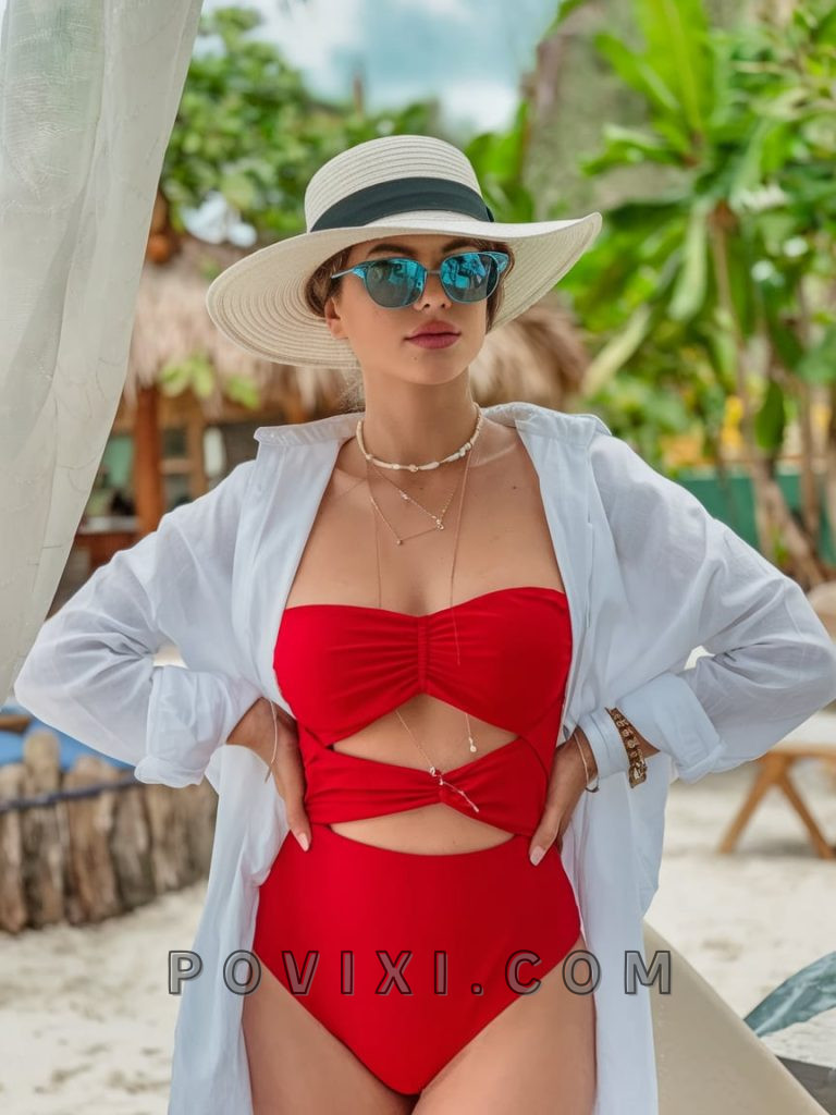 Nothing commands attention like a striking red swimsuit. This piece features a cut-out bandeau bikini styled with a white oversized cover-up shirt. A wide-brim hat and layered gold necklaces add to the baddie vibe, ensuring an effortlessly glamorous beach look. Perfect for those who love to stand out, this ensemble exudes confidence and class. Pair it with strappy sandals and a bold lip for a complete statement look.