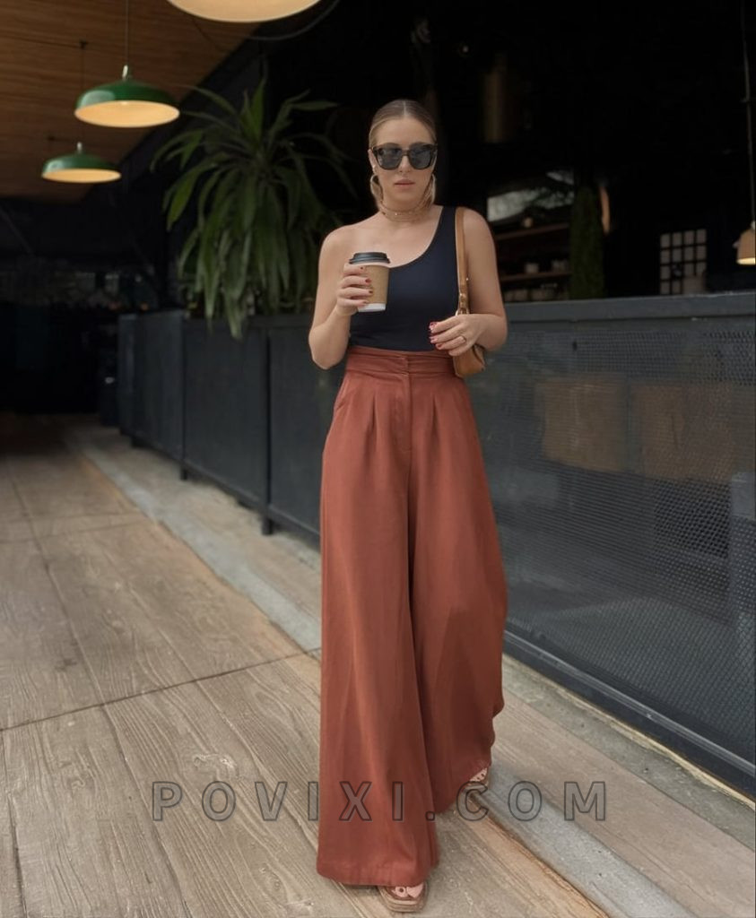This outfit transforms a casual black bodysuit into a summer staple. Paired with high-waisted rust-colored wide-leg pants, it’s perfect for those who want a sleek and modern aesthetic. A minimalist approach to accessories, including oversized sunglasses and a structured handbag, keeps the look polished. This is a great alternative to traditional beachwear, offering an elevated yet comfortable approach to summer styling. The breathable fabric ensures maximum comfort even on the hottest days.