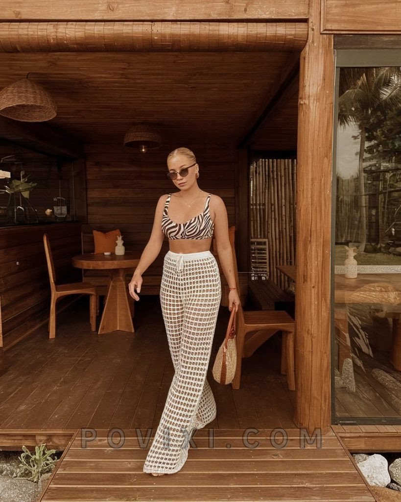 For those looking for black women ideas of luxury swimwear styling, this zebra-print bikini paired with white crochet pants exudes modern elegance. A structured tote bag and sleek sunglasses make this an ultra-chic summer outfit. This look is bold and trendy, ideal for those who love unique and eye-catching styles.