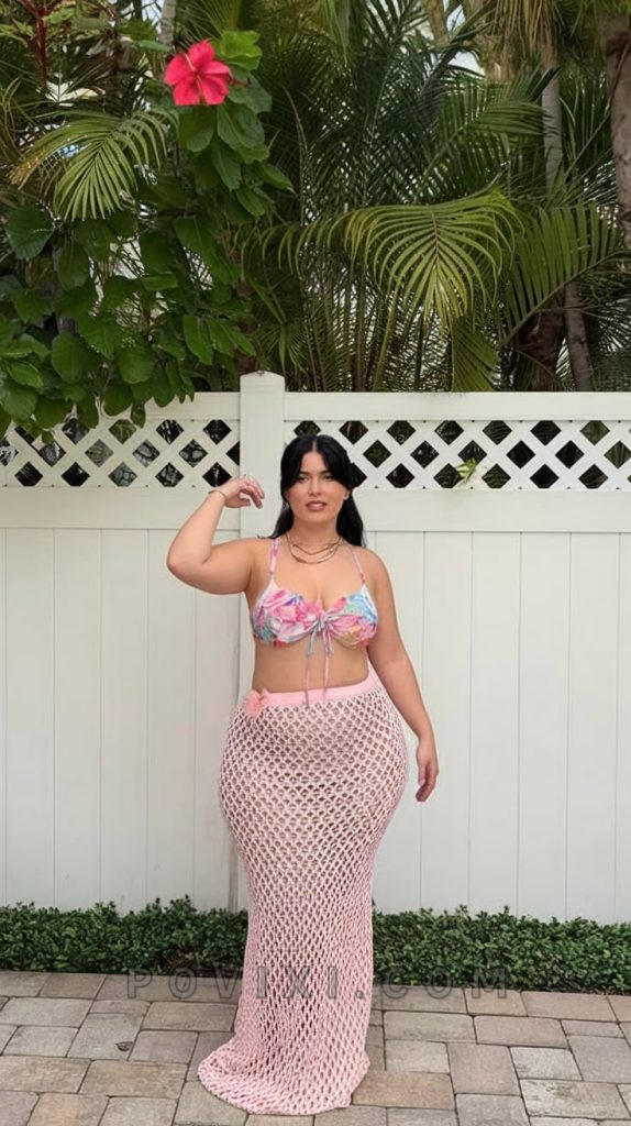 A blend of pink tones and feminine textures, this look combines a floral bikini top with a cover-up mesh maxi skirt. Ideal for plus size fashion lovers, it celebrates confidence and individuality while remaining stylish. The sheer texture adds a delicate touch, making it a standout ensemble.