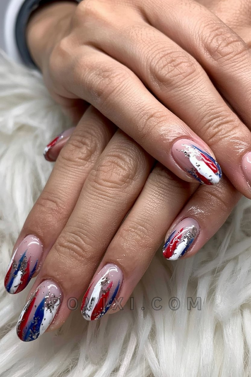 The combination of expressive brushwork with red, white and blue elements on a light nude background results in modern yet elegant nail art. Light vertical patterns make your fingernails appear longer with an oval shape while providing an edgy, minimalist look. This stylish outfit gets its sparkle from silver foil accents that create a dancing glow as you move while adding sophisticated charm at Independence Day parties. The style delivers fantastic results on natural nails and offers a striking, homemade design for those seeking simplicity.