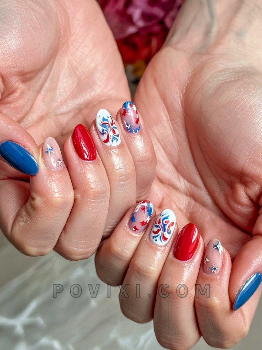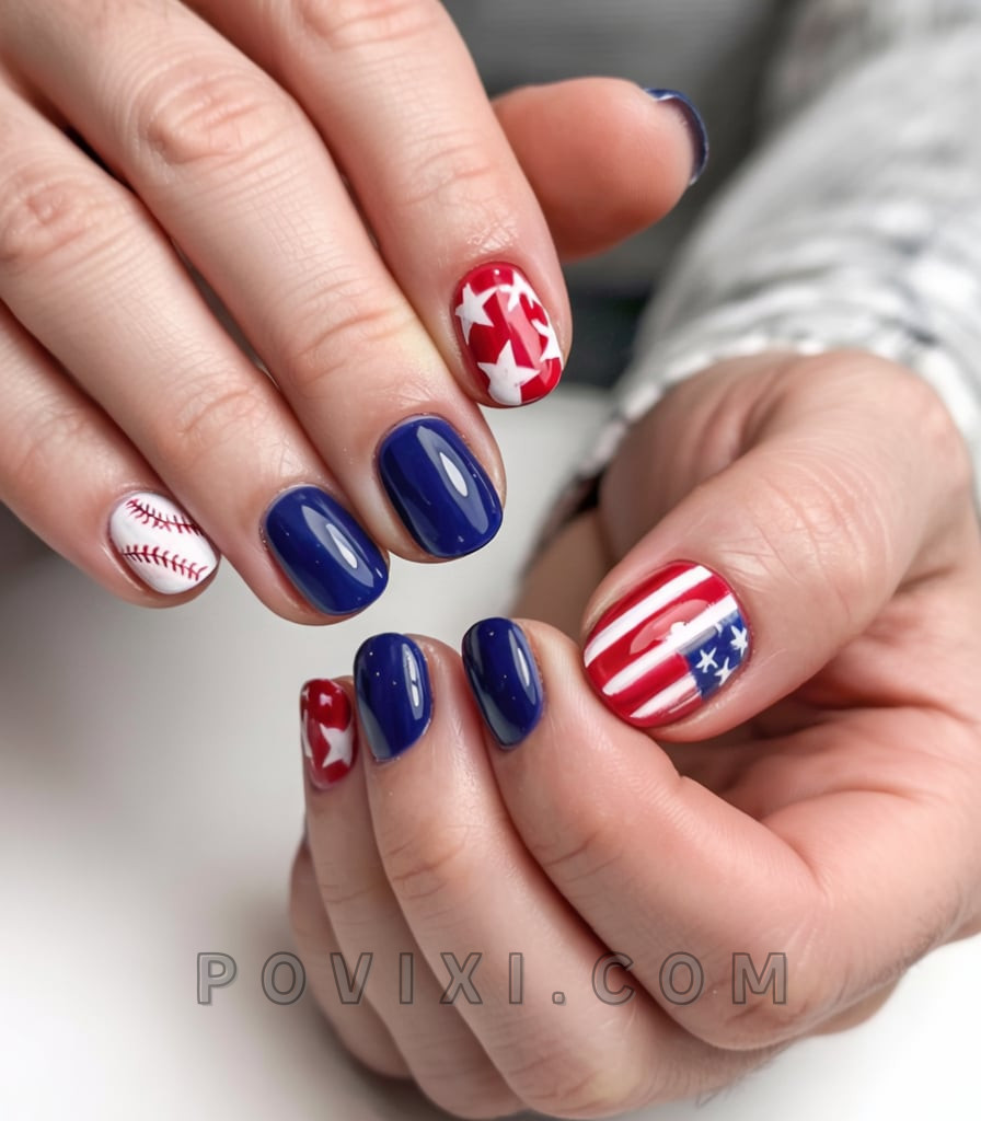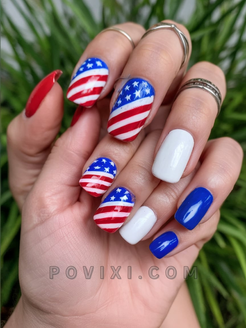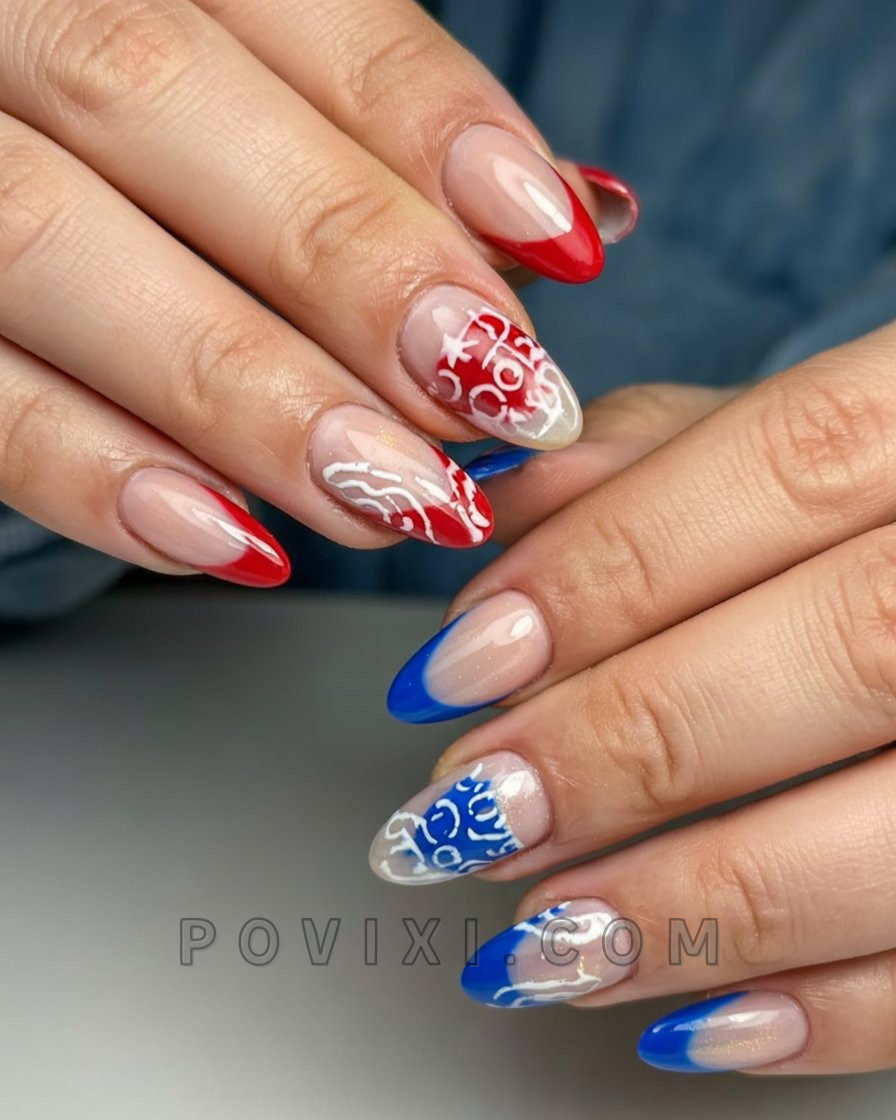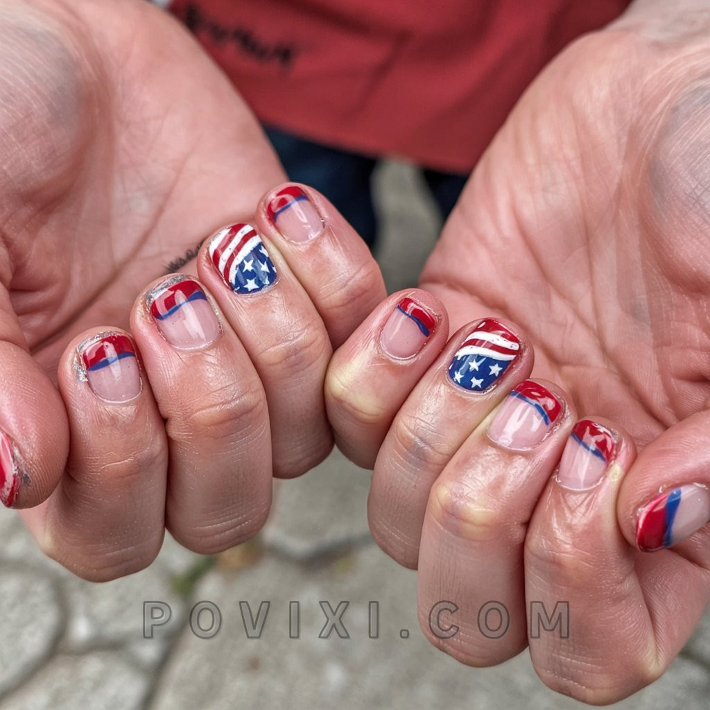 This sophisticated nail design combines solid red and blue nails with accents of star clusters, swirls and vibrant brush strokes. People who want an artistic, patriotic style will find this design perfectly suited to their tastes. This nail design successfully blends traditional color palettes with contemporary design elements, perfectly matching the popular trends of 2025. Swirl patterns can be created with either dip powder or do-it-yourself tools, as they are especially eye-catching under a matte top coat.