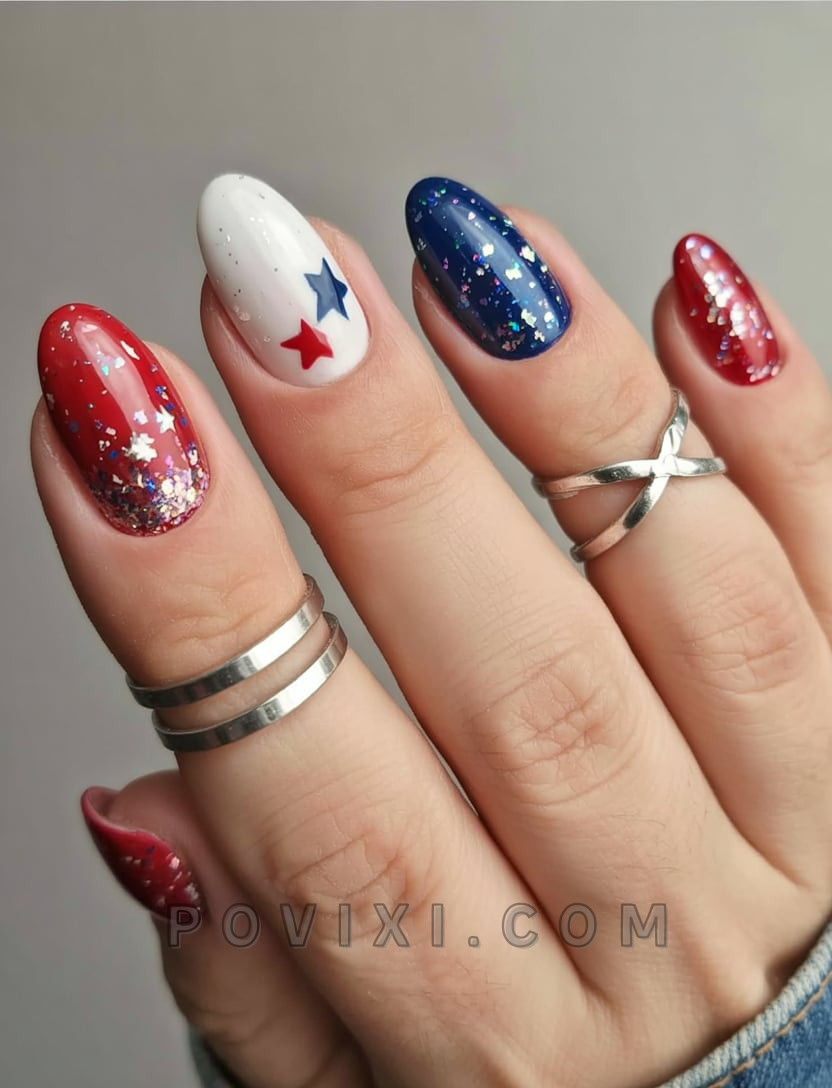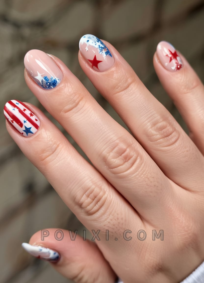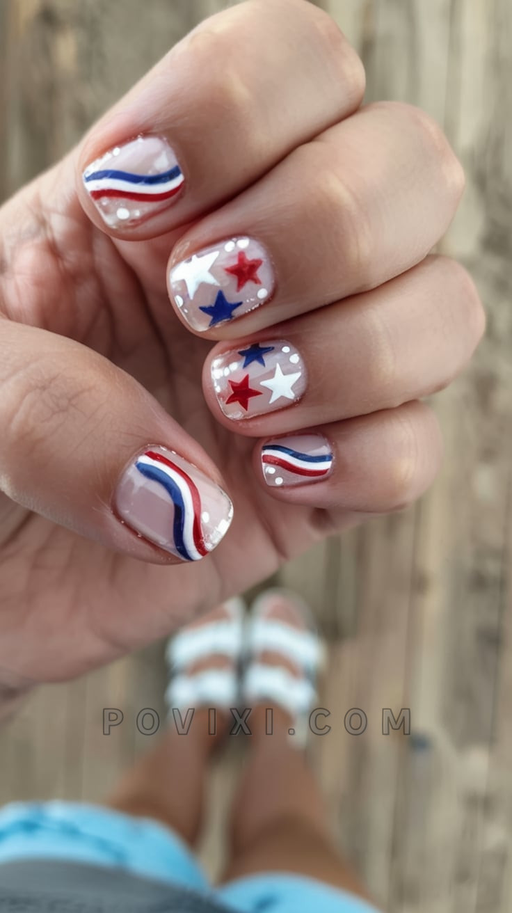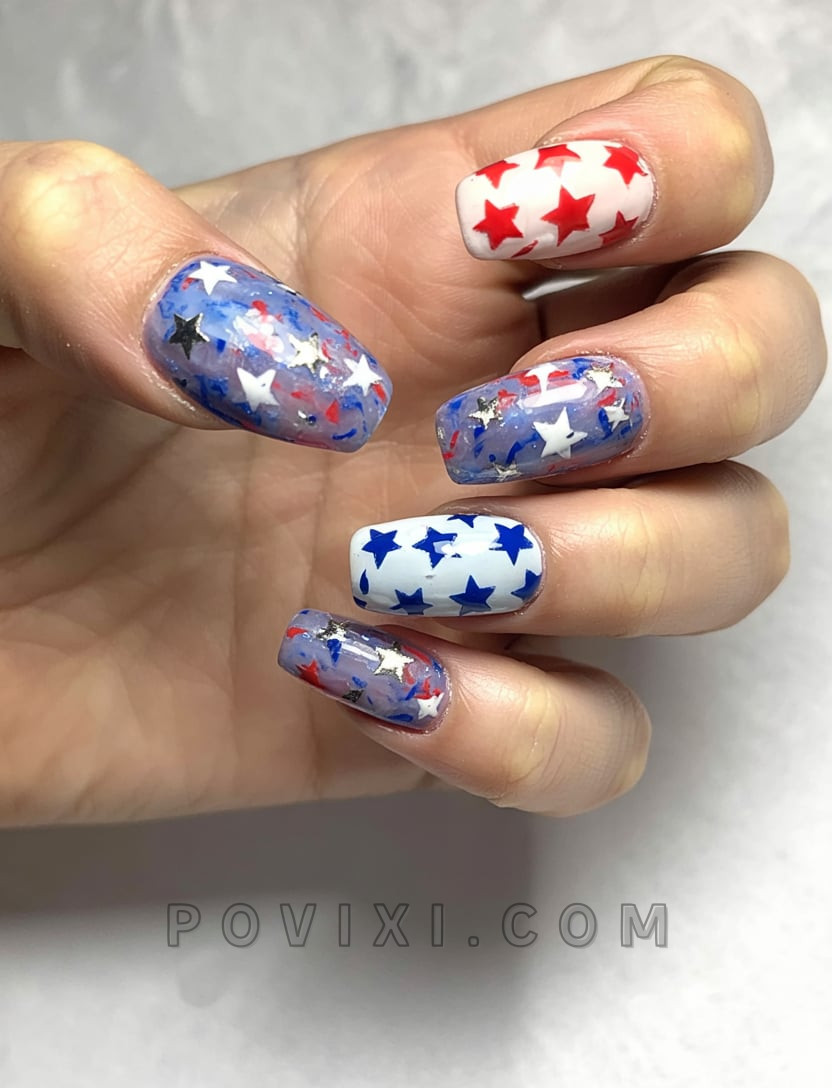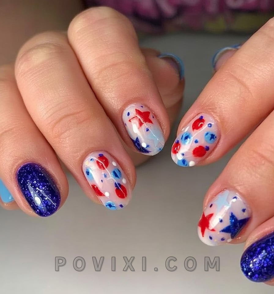 This sophisticated nail design combines solid red and blue nails with accents of star clusters, swirls and vibrant brush strokes. People who want an artistic, patriotic style will find this design perfectly suited to their tastes. This nail design successfully blends traditional color palettes with contemporary design elements, perfectly matching the popular trends of 2025. Swirl patterns can be created with either dip powder or do-it-yourself tools, as they are especially eye-catching under a matte top coat.