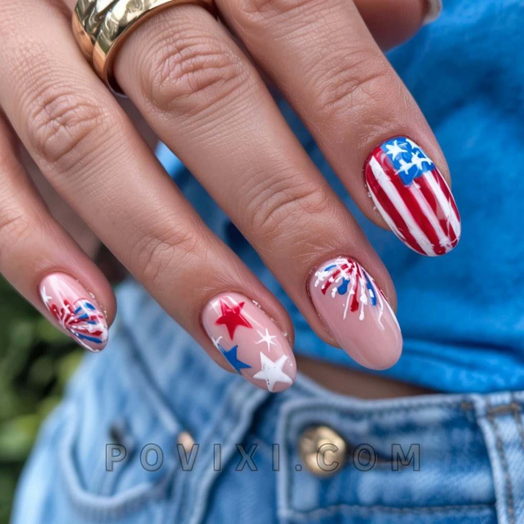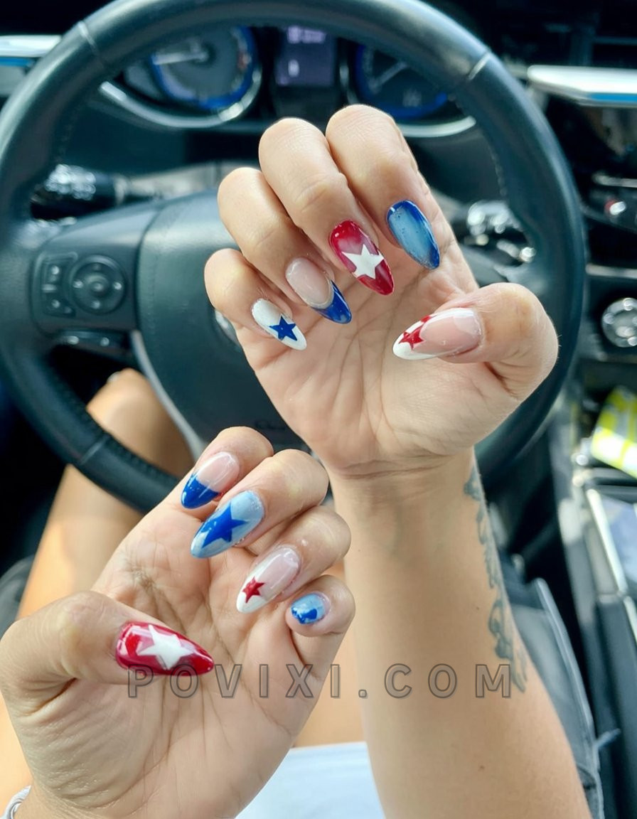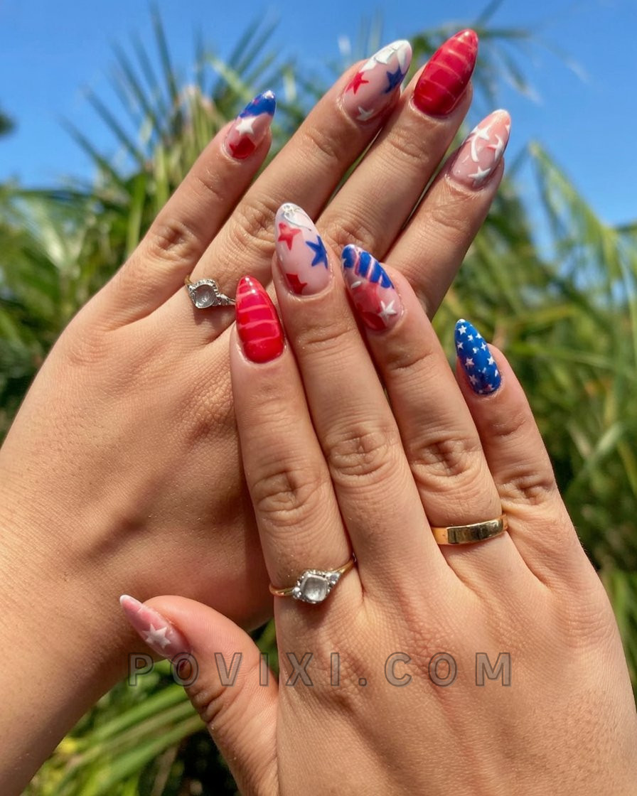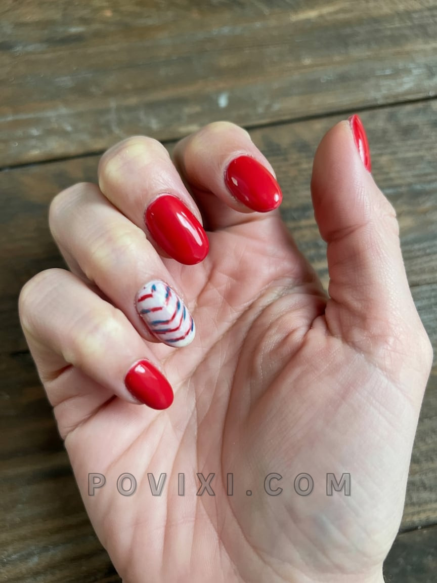 Sometimes less is more. Deep red nails are paired with abstract striped accents that include red, blue and white stripes for an elegant interpretation of the Fourth of July. The oval nail shape that characterizes these designs gives them a contemporary and inviting look that fits the 2025 aesthetic. Such an effortless style suits women who want to be festive while avoiding complicated nail arrangements.
