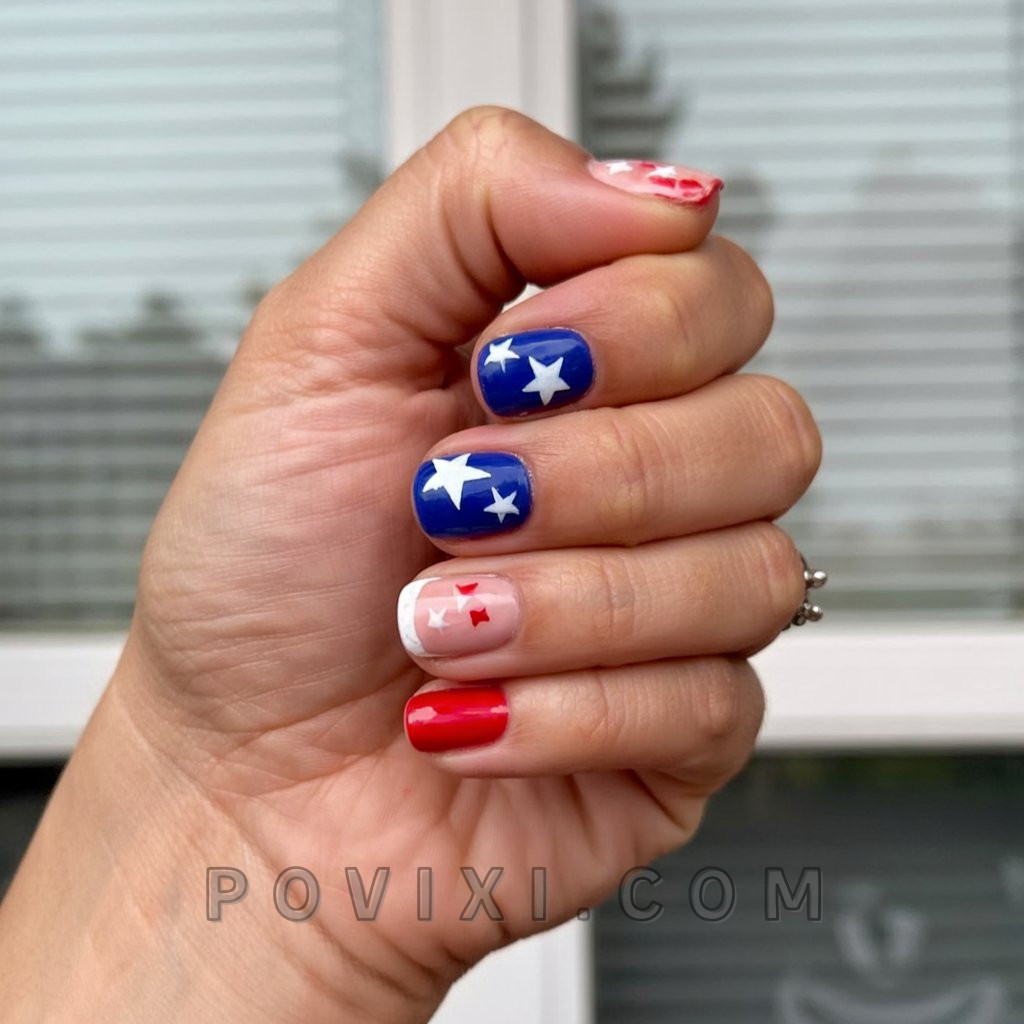 Choose square or short nails for a big impact without the need for longer nails. A fresh patriotic look is created with blue nail polish paired with white stars and alternating French tips in red and minimal white designs. The modern design style fits both 2025 and each nail type, using either acrylic or natural nails. This design is perfect for people who want functional nails and want their hands to stand out at social gatherings.