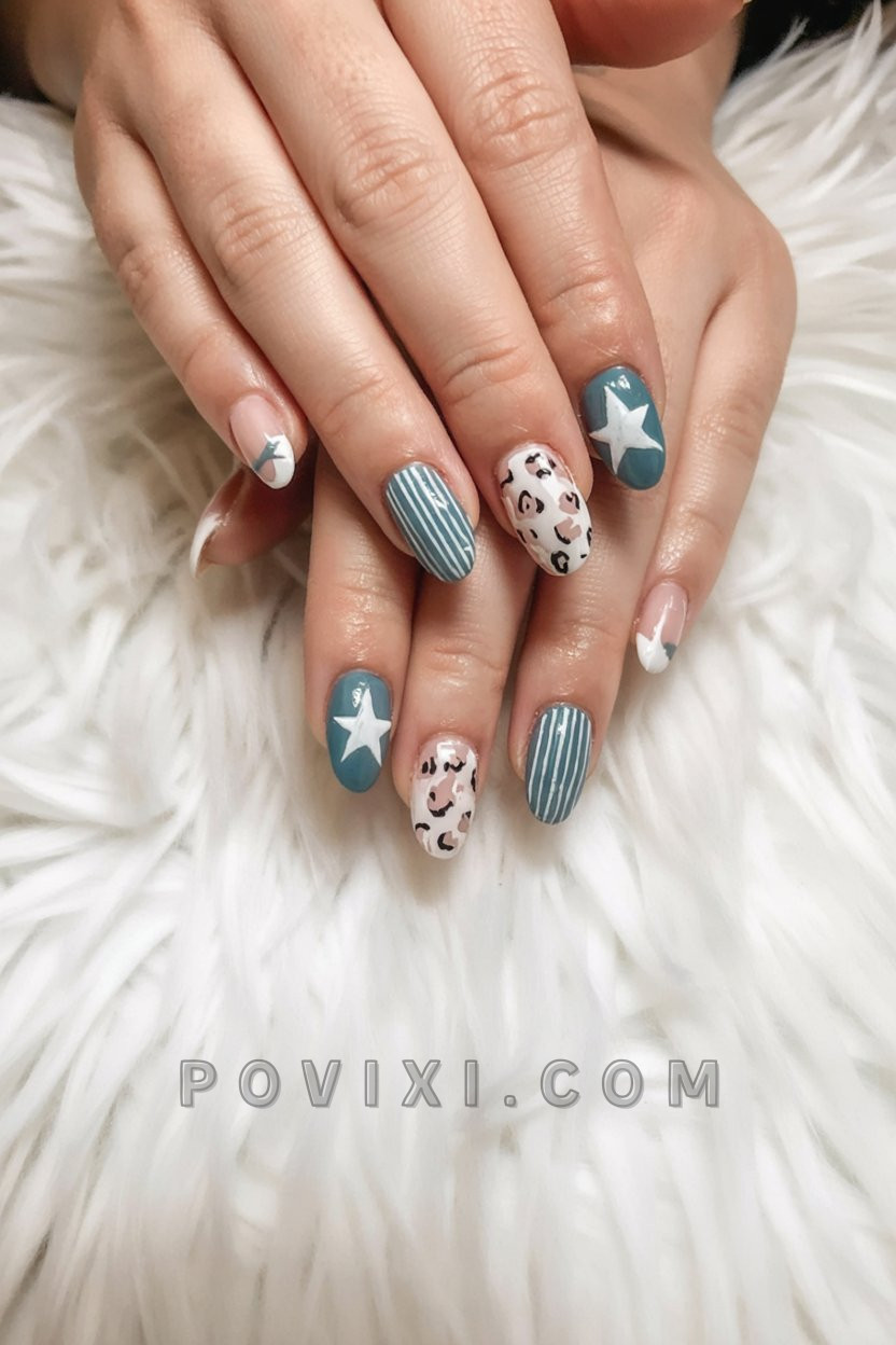 The patriotic look combines classic blue stripes and white patterns with edgy star elements and leopard design pieces for a modern, fashionable look that honors America’s flag. The square shape gives this design a contemporary appeal, and the teal-blue tones introduce innovative color elements to the regular red-white-blue color scheme. Acrylic or dip powder fans looking for nail durability through the summer can choose this design, while fashion trendsetters who enjoy pattern mix-ups will find it suitable.