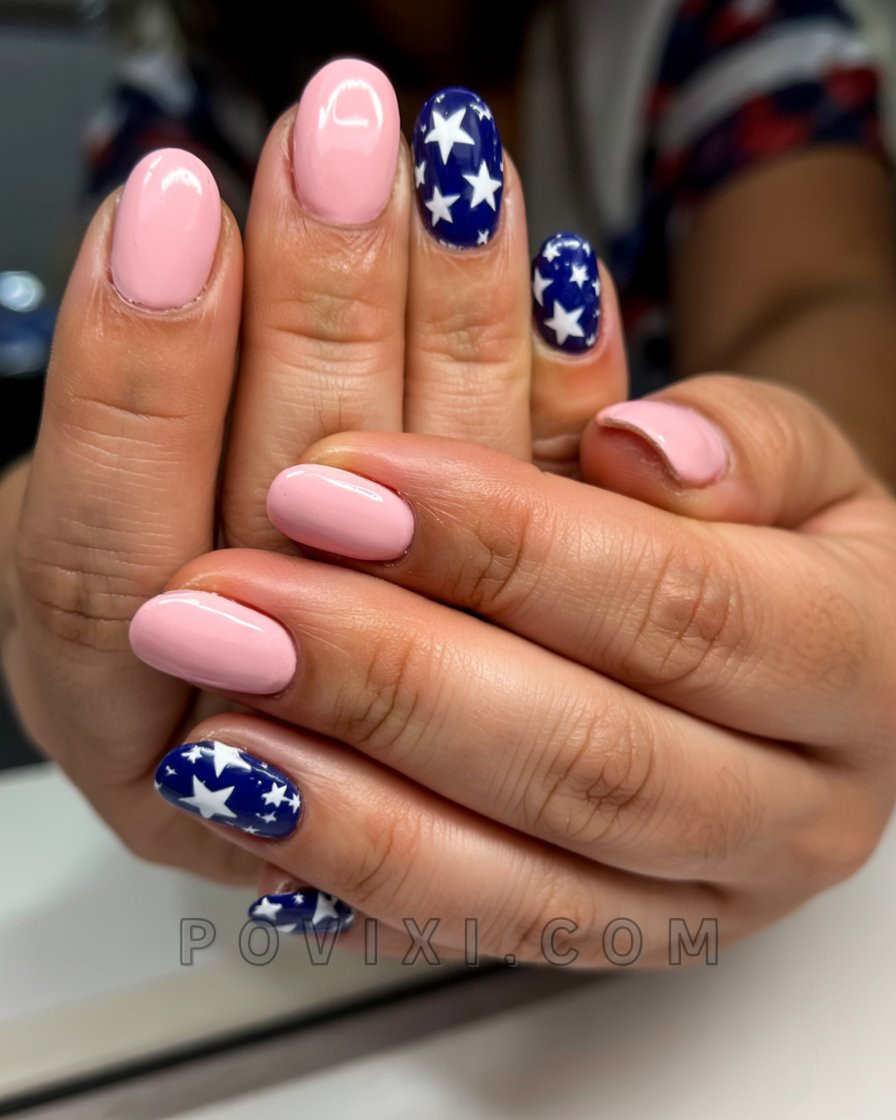 This nail combination meets the needs of individuals who love design simplicity while expressing boldness through soft, glossy pink nails enhanced with deep navy and white star accent nails. The nail design incorporates American flag elements in a contemporary way that delivers everyday usability while maintaining enough boldness for celebration/shopping. The oval nail shape enhances any hand appearance with a sophisticated style. The complete ensemble would look great with a white sundress to celebrate America’s independence.