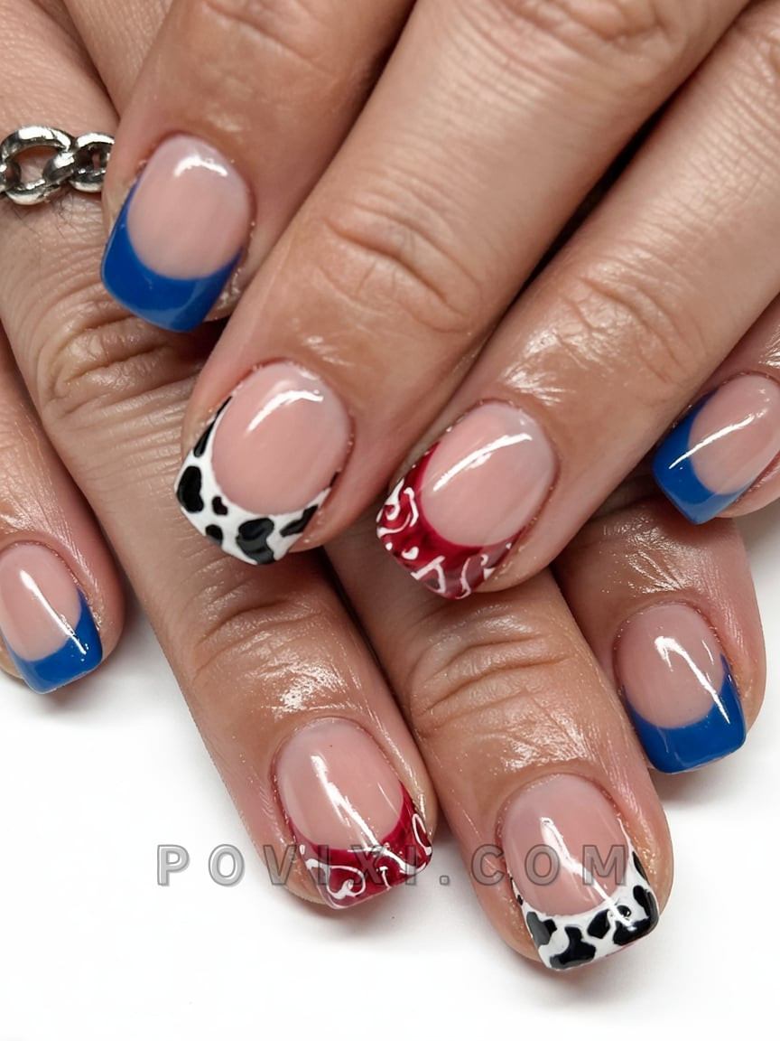 This American-inspired design pairs blue French tips with paisley red borders and black and white cow-inspired details. The playful combination creates a trendy result beyond the typical Fourth of July French tips with basic design elements. This square geometry on gel nails presents a modern and trendy design for those who want to create nail art but stick to timeless color traditions.