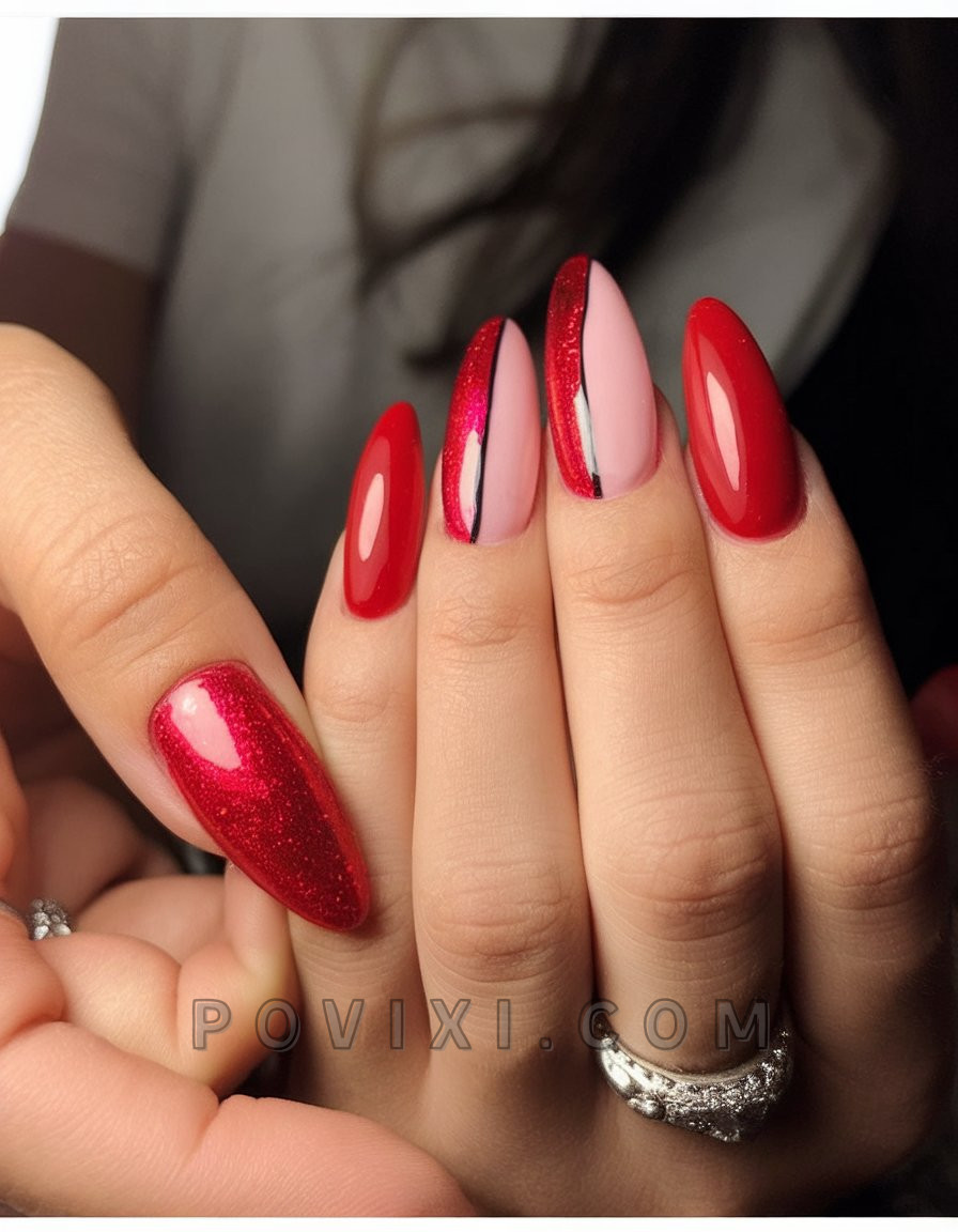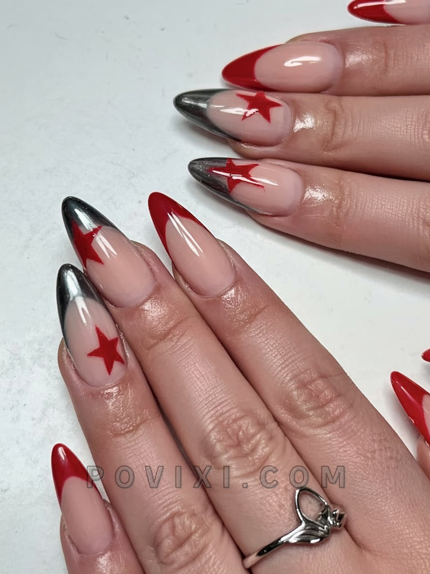 Enhance your summer manicure with the winning combination of metallic chrome and dramatic red French tips that showcase striking star elements. The pointed almond extension creates the illusion of finger length for dramatic results. Trendsetters will find this design a remarkable statement, while the red stars make it an eye-catching design that goes beyond the norm. To make the look pop, apply a glitter top coat, as this trendy 2025 design requires.