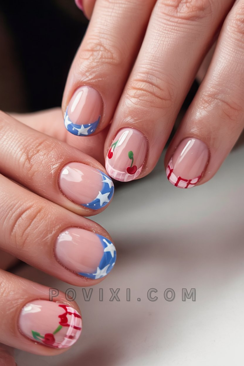 This set offers artistic inspiration for those who love to mix traditional designs with a nuanced, playful style. French tips feature blue with stars that match red cherries along with pink gingham for a light vintage picnic feel. The rounded nail design remains easy to use while creating a gorgeous short nail look. This design creates an instant summer appeal that looks great with a dress and basket bag at any summer gathering.